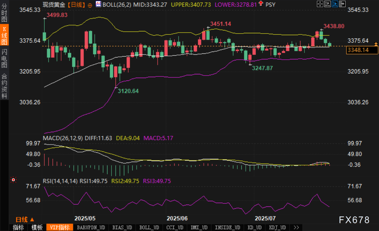 从日线图观察,黄金在上行至3438.80美元后回落,目前重新逼近布林带中轨3343.27美元,日K连续收阴,呈现小幅回撤格局。当前布林带整体收敛,反映行情进入整理状态。分析认为上方布林带上轨3400.73美元构成关键阻力,若不能有效突破,短线或维持横盘震荡。布林带下轨支撑位于3278.81美元附近,若有效跌破则有可能打开下行空间。