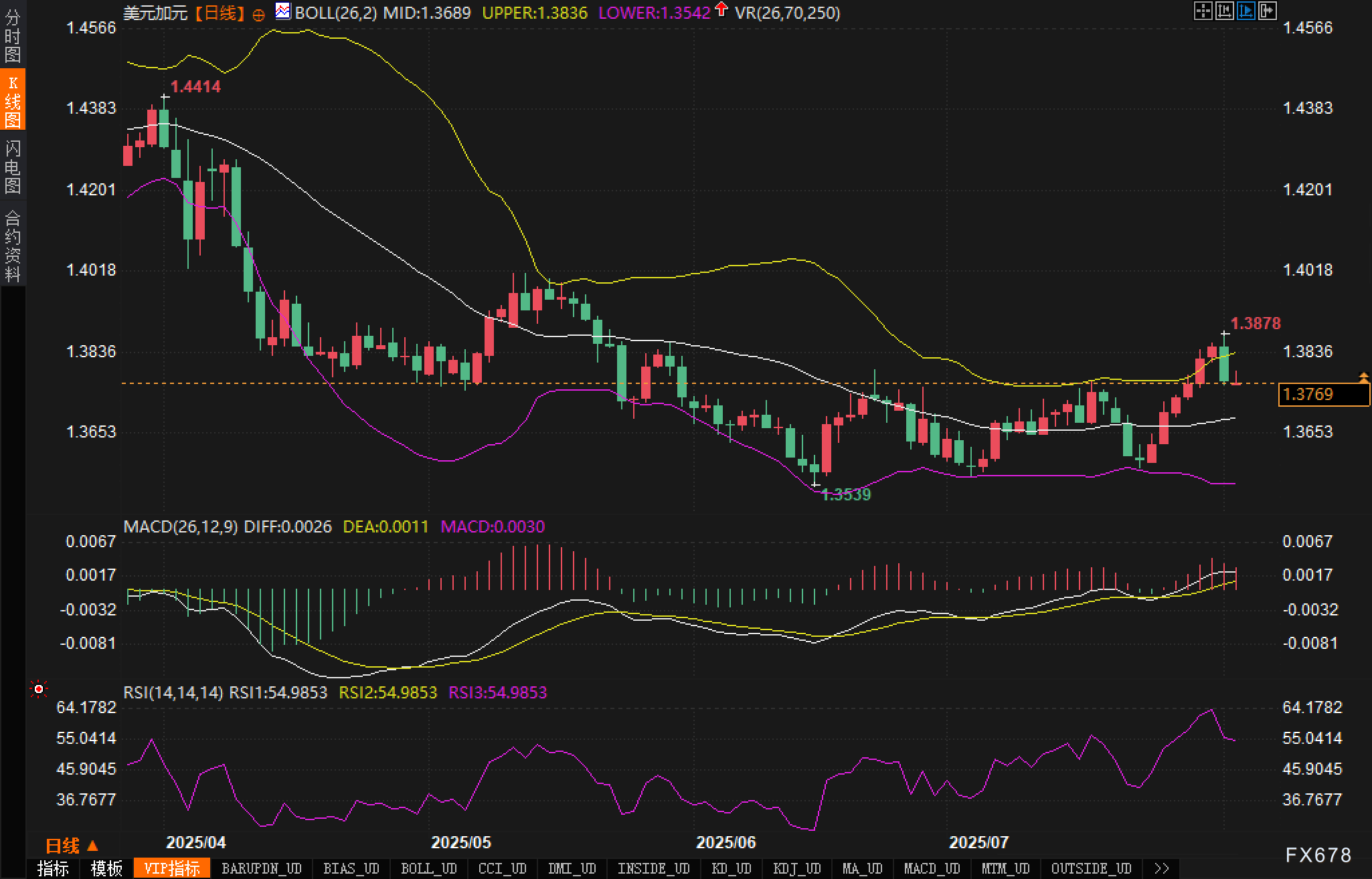 从日线图观察,美元/加元汇价自低点1.3539反弹以来,整体呈现出温和震荡上行趋势。布林带呈现轻微开口状态,中轨上移至1.3689附近,当前价格接近布林上轨1.3836附近运行,暗示短线仍有惯性上冲动能,但也面临技术性压力区。若能有效突破1.3880上方区域,则有望进一步测试1.4000整数关口;若未能企稳,将回测1.3769水平支撑,该位置亦为近期震荡平台的顶部,具有重要参考价值。