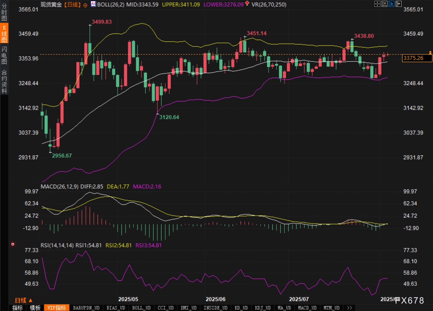 基本面: 黄金近期的上涨动力来自于美国疲软的经济数据与降息预期升温。上周公布的非农就业数据显示劳动力市场明显走弱,强化了市场对美联储9月开启新一轮降息周期的押注。CME FedWatch工具显示,市场对9月降息概率的预期已超过90%。与此同时,美国6月工厂订单大幅下降4.8%,进一步凸显经济疲态。 另一方面,美国总统特朗普上周签署行政命令,提高对数十国进口商品的关税,其中与美存在贸易逆差的国家最低征税比例达到15%。相关措施即将生效,这种不确定性持续干扰全球市场情绪,也支撑了黄金的避险属性。 不过,美元出现小幅反弹,部分抵消了黄金的上行动能。交易员将关注即将公布的美国ISM服务业PMI数据,以判断经济放缓是否蔓延至服务领域。 技术面: 从黄金日线图来看,价格近日运行于布林带中轨(3343.59)和上轨(3411.09)之间,仍未有效突破关键阻力区域。整体走势维持在中期震荡通道之内,未形成明显趋势方向。