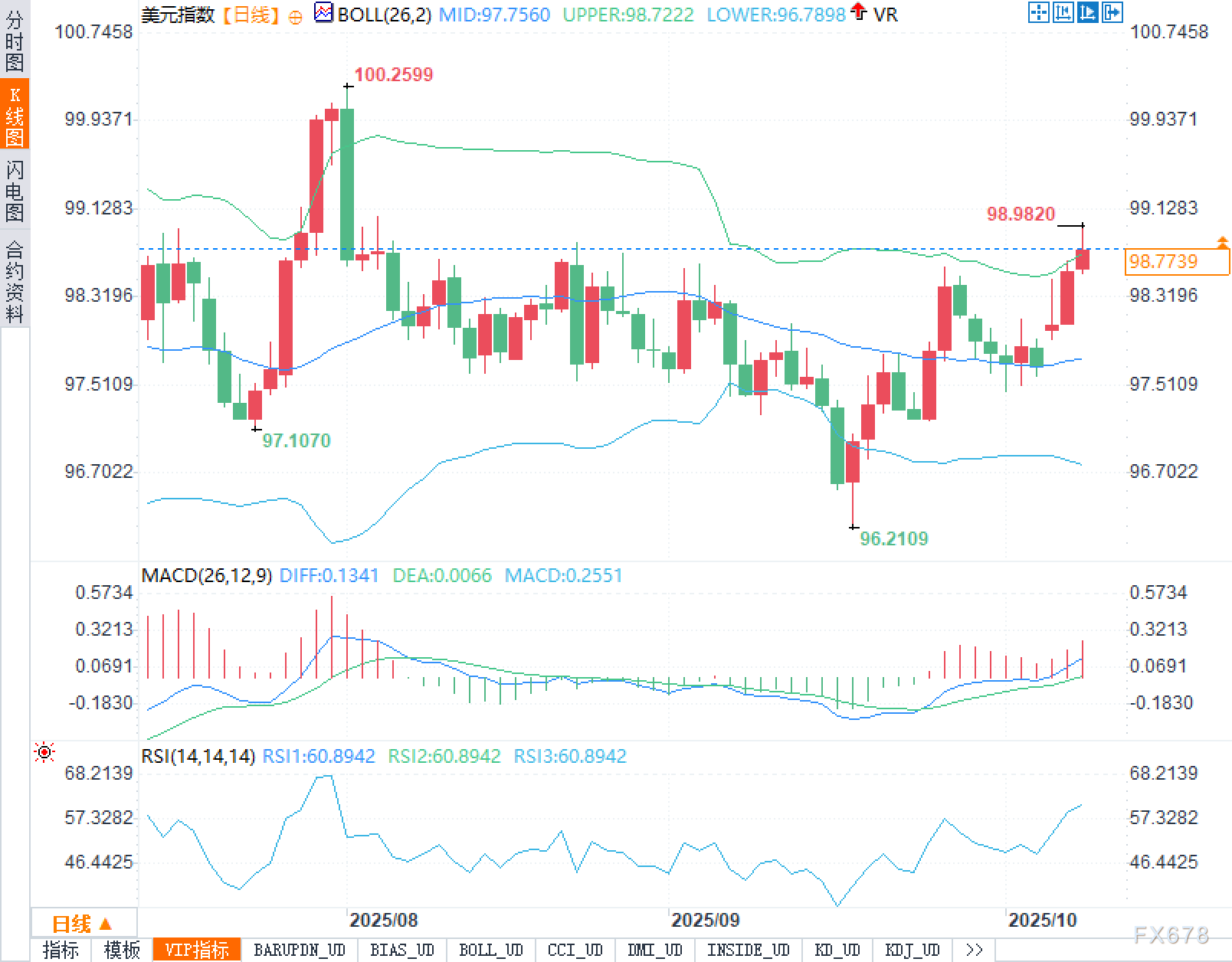 近期的上行本质上是两股力量叠加:其一,停摆延长导致“数据真空”,市场难以获得新的基本面证伪,美元多头享受时间溢价;其二,前期自100下方回撤后的空头仓位在98上方被迫回补,推动了“短线挤压”。与此同时,联储官员密集放话与纪要在即,促使场内更偏向“消息前的风险平价”与“事件冲击后的再定价”。